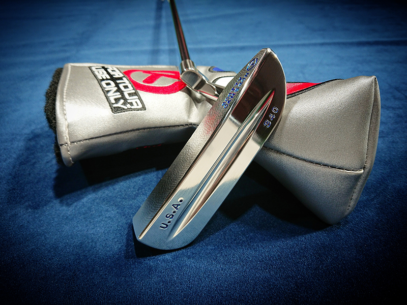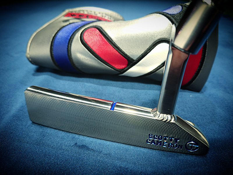 バックに"ハンド"スタンプ、CRAFTED。フェース面ヒールにSCOTTY CAMERON、サークルT。ソールにU.S.A.、340。ブレットボトム。トップライン。 グリップ:Blue leather perforated ヘッドカバー:Stick Figure Circle-T Silver USA