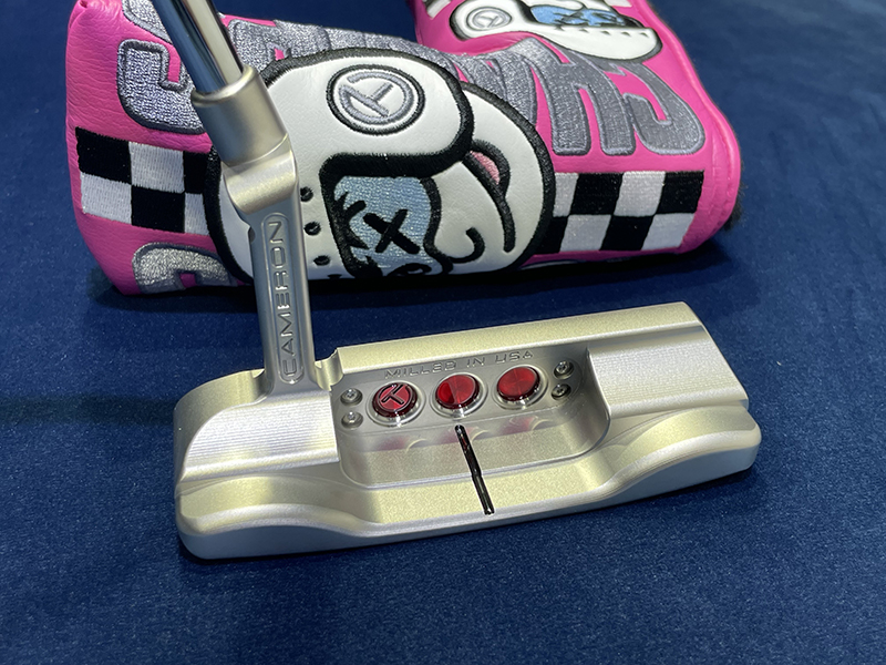 バックキャビティに3チェリーボンブ。ヒール側のボンブにサークルT。フェース面ヒール側にサークルT。ソールにSCOTTY CAMERON、NEWPORT+ 、FOR TOUR USE ONLY。サークルTウェイト、20G。フランジライン。 グリップ:Circle-T full-contact Black/White ヘッドカバー:Pink Champs Choice Circle-T