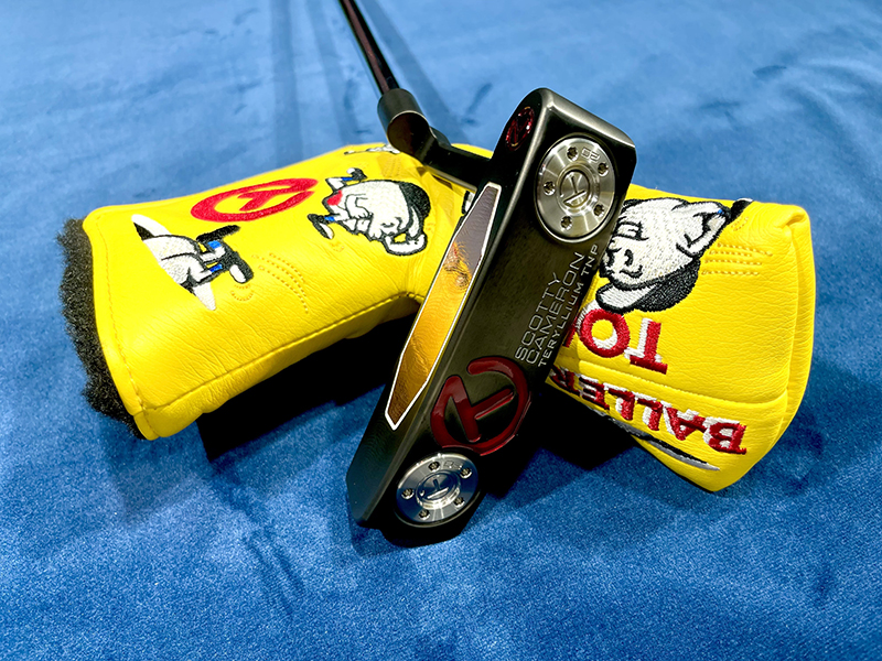 フェース面ヒールにサークルT。ネックにCAMERON。ヒールバンパーにTOUR、トウバンパーにONLY。ソールにSCOTTY CAMERON、TERYLLIUM TNP、サークルT。サークルTウェイト20g。 グリップ : Pistolini Plus Circle-T Black/Gray ヘッドカバー : Baller Boy Circle-T Yellow