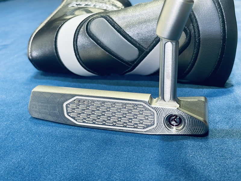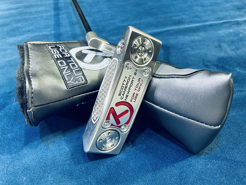 バックキャビティに3チェリーボンブ。ヒール側のボンブにサークルT。フェース面ヒール側にサークルT。ソールにSCOTTY CAMERON、NEWPORT+ 、FOR TOUR USE ONLY。サークルTウェイト、20G。フランジライン。 グリップ:Circle-T full-contact Black/White ヘッドカバー: Circle-T Stick Figure Charcoal