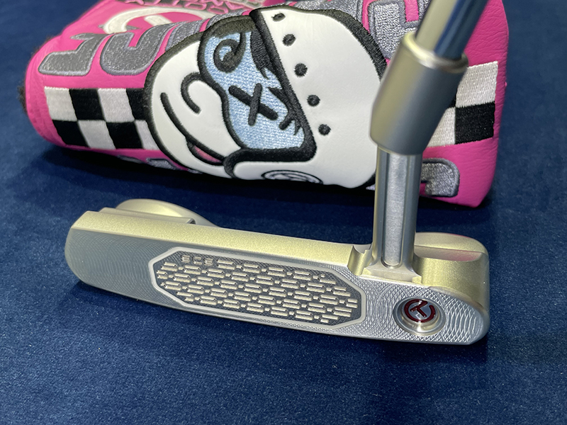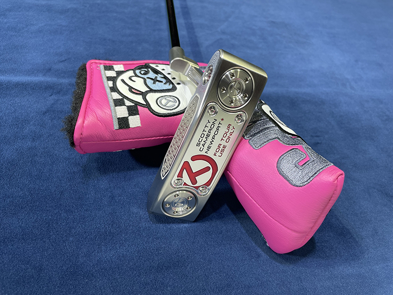 バックキャビティに3チェリーボンブ。ヒール側のボンブにサークルT。フェース面ヒール側にサークルT。ソールにSCOTTY CAMERON、NEWPORT+ 、FOR TOUR USE ONLY。サークルTウェイト、20G。フランジライン。 グリップ:Circle-T full-contact Black/White ヘッドカバー:Pink Champs Choice Circle-T
