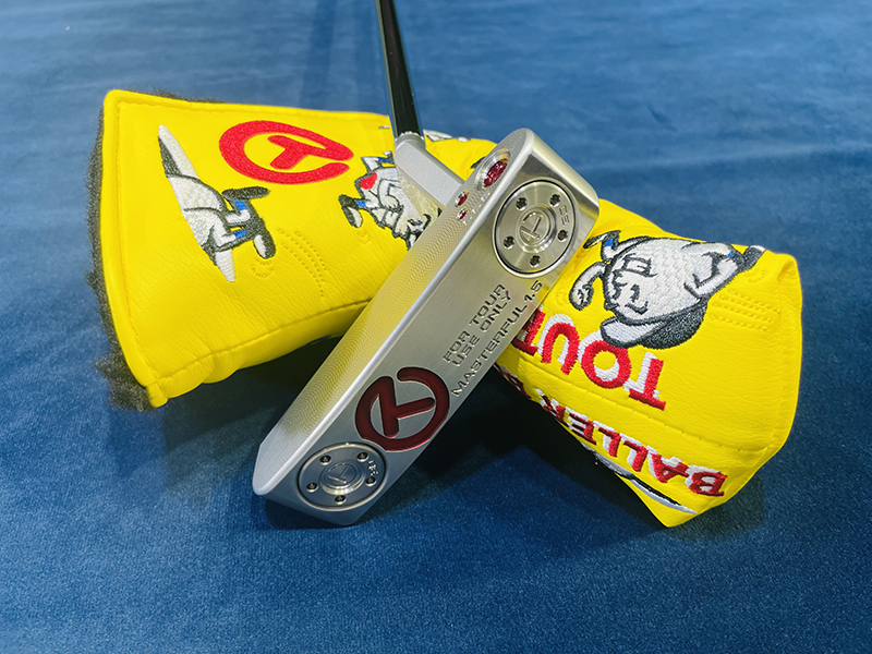 バックキャビティにダブルミルドチェリーボンブ、ボンブの中にサークルT、TOURTYPE SSS、SCOTTY CAMERON。フェース面ヒールにダブルミルドチェリーボンブ、ボンブの中にサークルT、SSS。ソールにサークルT、MASTERFUL1.5、FOR TOUR USE ONLY。サークルTウェイトT30g。トップライン。 グリップ : Circle-T full-contact Black/White ヘッドカバー : Baller Boy Circle-T Yellow