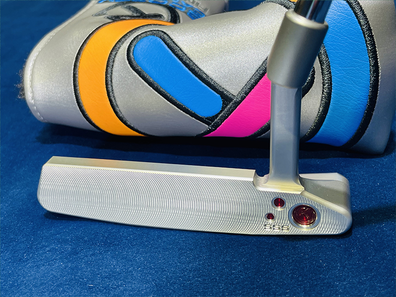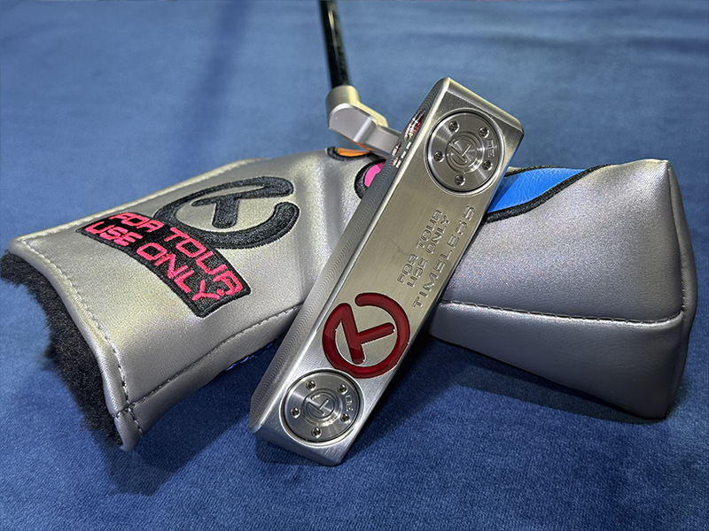 バックキャビティにダブルミルドボンブ、ボンブの中にサークルT、TOURTYPE SSS、SCOTTY CAMERON。フェース面ヒールにダブルミルドボンブ、ボンブ中にサークルT、SSS。ソールにサークルT、TIMELESS、FOR TOUR USE ONLY。サークルTウェイトT30g。フランジライン。 グリップ : Circle-T full-contact Black/White ヘッドカバー : Stick Figure Circle-T Silver/Pink/Blue/Orange