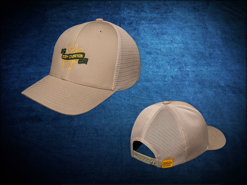 前面中央に「Feelin' Lucky Scotty Cameron」のクローバーデザインがあしらわれた、カーキ色の調節可能なFlexfit 110®メッシュトラッカーハット。ポリエステルとコットンの混紡素材を使用し、ほとんどの方にフィットするフリーサイズのスナップバッククロージャーを採用しています。トレードマークであるPermacurv®バイザーを備えたこのハイテク構造の帽子は、選手に人気のアイテムで、黄色のStudio Designクランプラベルが付いています。