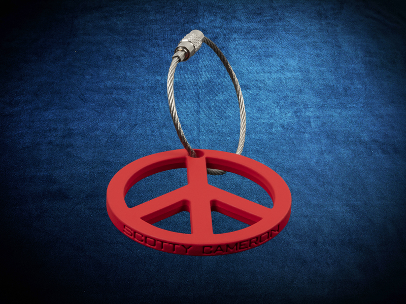 真鍮から削り出して、表面をラバーでコーティングしたピースサインのキーフォブです。スコッティのツアーパターにもハンドスタンプでデザインされています。ステンレスのケーブルリングを外して、マーカーとしても使用できます。